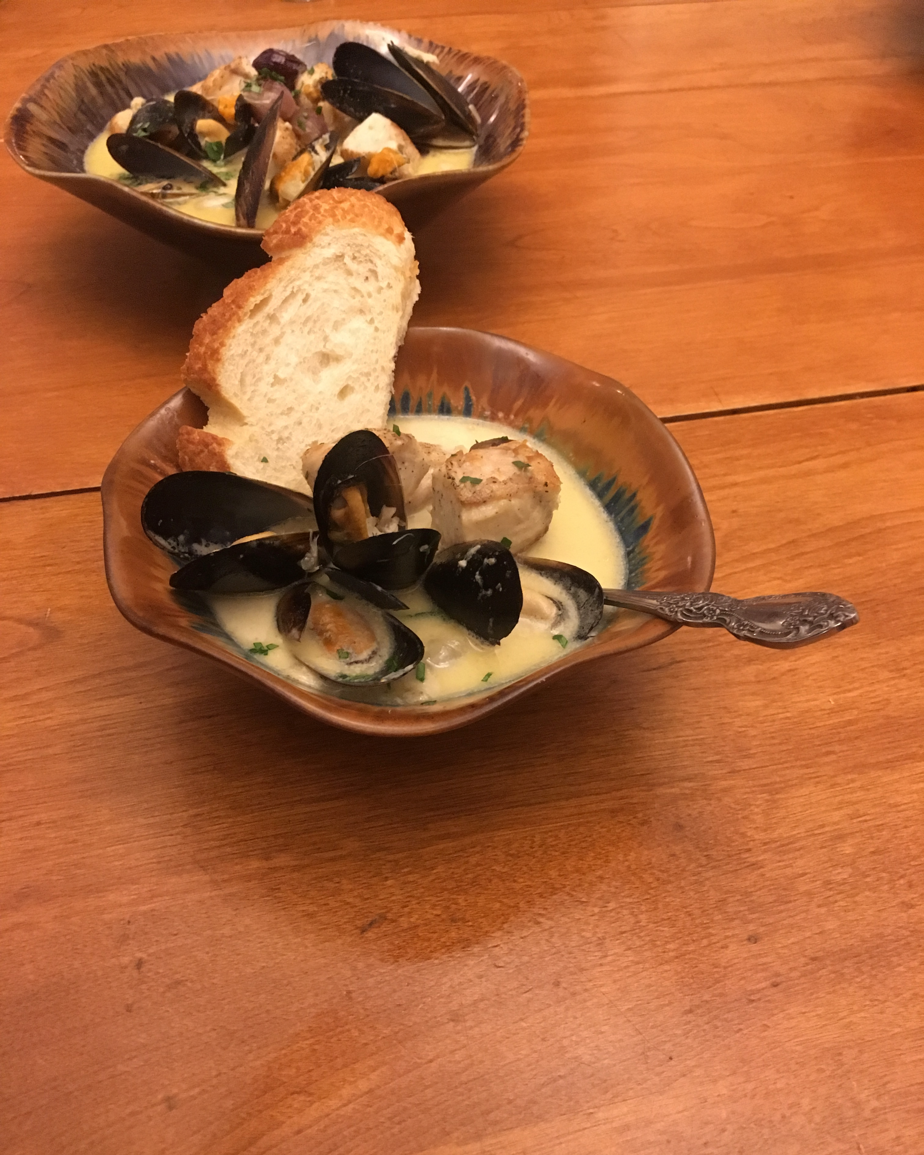 While the soup is simmering, season fish with salt and pepper and add to oiled saute pan on medium high heat. Cook for 2-3 minutes until a golden crust forms on the edges, flip and continue to do the same on the over side. Add mussels and ladle 2 cups of the soup base into the pan and cover. Steam just until the mussels start to open. Transfer fish and mussels and pan liquid to soup base, add crab meat, bring to a simmer and serve.